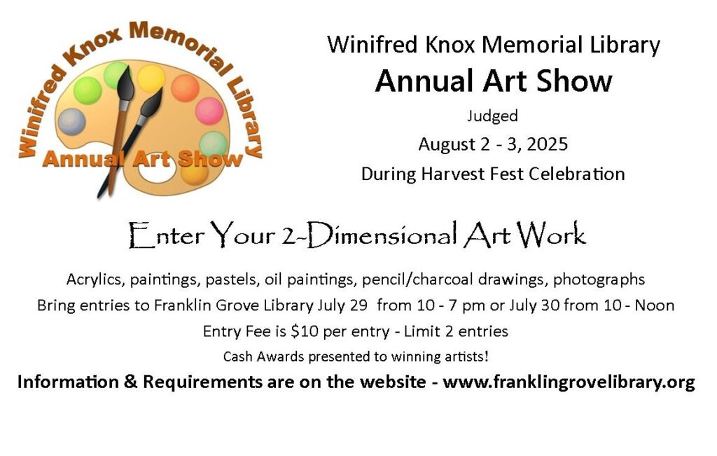 Calling all artists…today’s the day to begin entering your artwork into our annual art show! We are open from 10:00 a.m.-7:00 p.m.